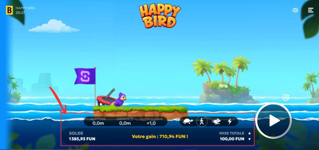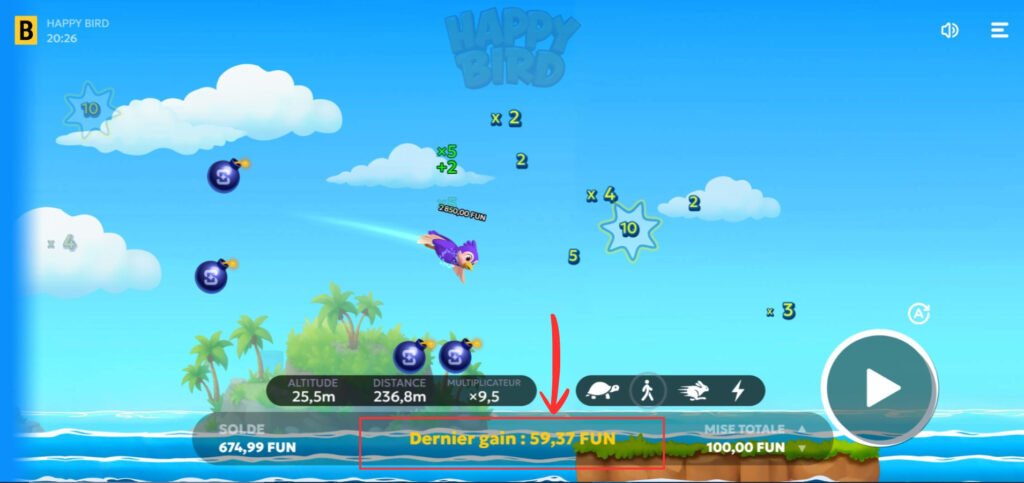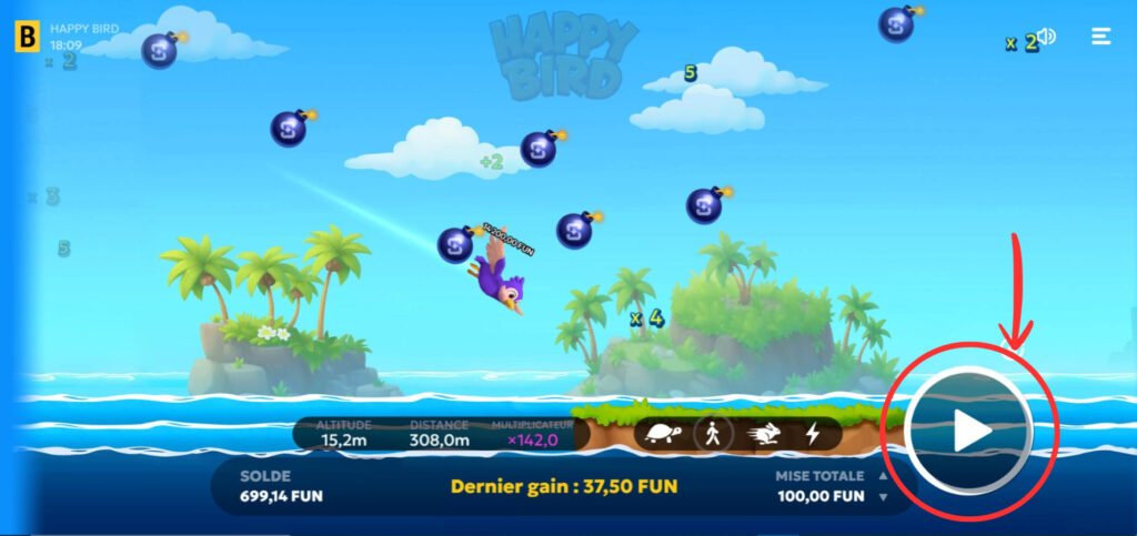 Once your settings are ready, click the “Play” button to send your bird flying. Your multiplier always starts at x1.0 and evolves based on the symbols encountered during the flight.
